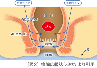 肛門に近い直腸癌においては、永久人工肛門をできるだけ造設しなくてよい究極の肛門温存術 ISR(内肛門括約筋切除)を行うこともできます(図1.2)。これらの究極の肛門温存術を腹腔鏡手術やロボット支援下手術で施行可能です。