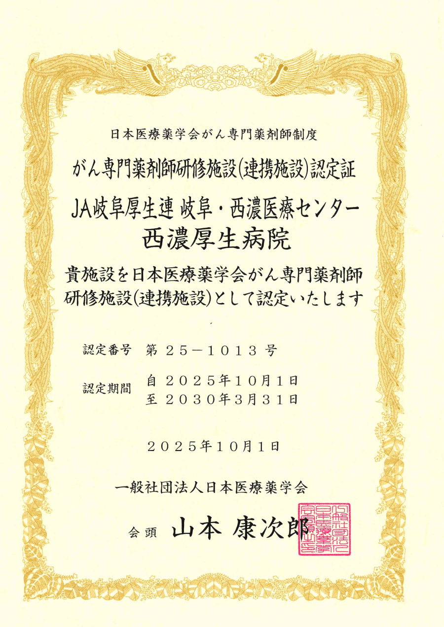 育てる病院 - 当院は、一般社団法人日本医療薬学会が認定する「がん専門薬剤師研修連携施設」です。がん治療における薬物療法は高度化しており、安全かつ効果的に行うためには専門的な知識を持つ薬剤師の存在が不可欠です。地域医療に貢献し、未来のがん医療を支えるがん専門薬剤師を育成します。