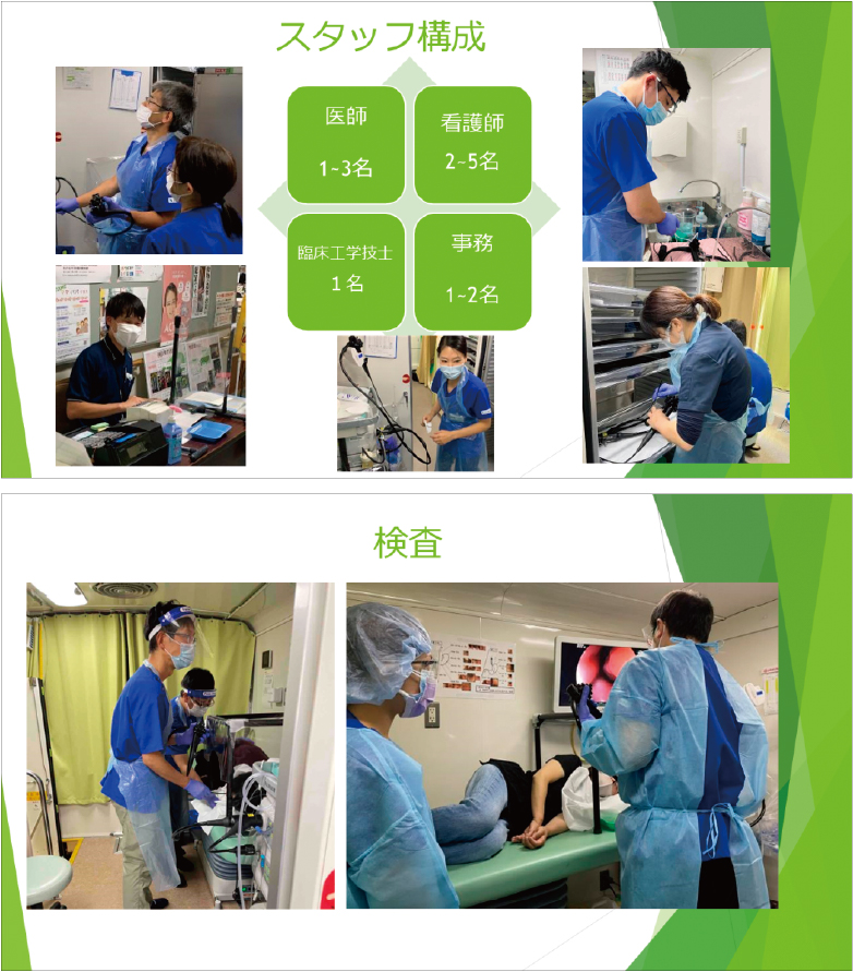 検診車の大きさは、地方の公民館など狭いスペースの検診場所にも出動できるよう、中型バスを用いています。炎天下での検診や内視鏡の光源から発生する熱を想定し、十分な空調設備を自家発電でもまかなえるよう設計しています。また2022年には検診バス内でも内視鏡の洗浄が行えるよう改修を行い、一日あたりの検査稼働件数も60件程度まで大幅に増やすことが可能となりました。