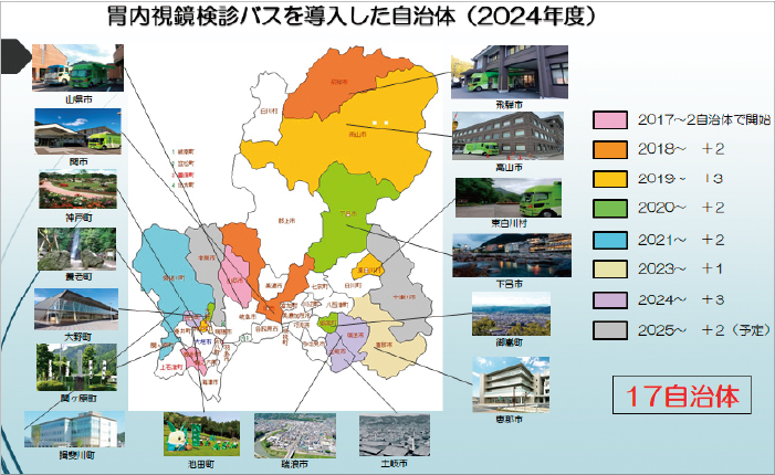 多くの自治体から要請を受け、2025年度には岐阜県下17自治体で導入しており、年間3000件近い胃内視鏡検査を行っています。日本消化器内視鏡学会専門医か同等の技術を持つJA岐阜厚生連の消化器内科医師(約20名程度で輪番)と看護師、事務スタッフらで各自治体に出向いて実施しています。