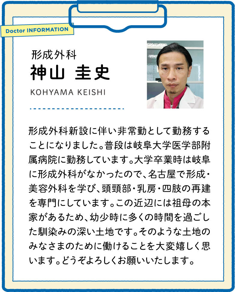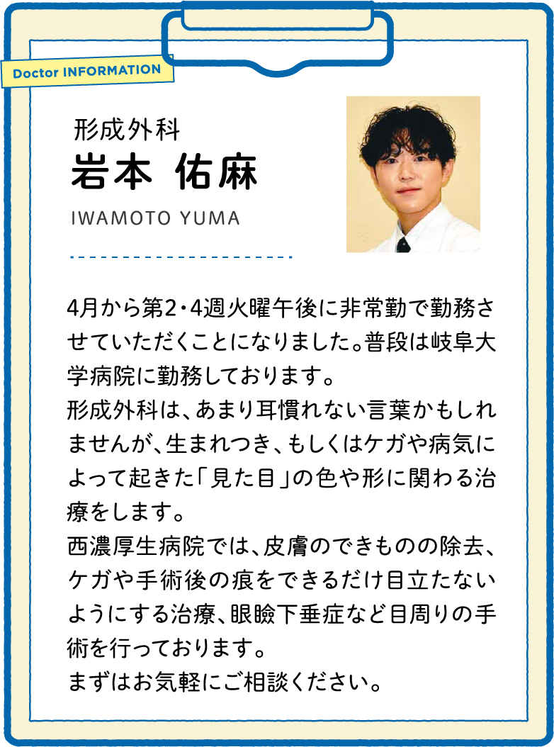2024年12月より当院で形成外科の診療を開始しました。形成外科の歴史は浅く、こと岐阜県の形成外科医数は全国ワーストに近いため、どんな病気を治療しているのかわからないかも知れません。形成外科とは、からだに生じた組織の異常や変形、欠損、あるいは外見上の不満足に対しあらゆる手法や特殊な技術を駆使して、機能のみならず見た目にもより正常に、さらにはより美しくすることによって、生活の質の向上に貢献する外科系の専門領域です。具体的には以下の病気の手術的治療を主に行っています。