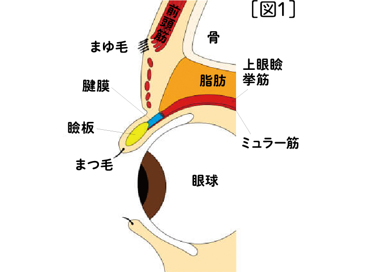 まぶたを直接あげる筋肉としては上眼瞼挙筋とミューラー筋があります。眼瞼挙筋は腱膜を介して、ミューラー筋は直接、まぶたの縁にある瞼板というやや硬い板のような組織につながっています。これを持ち上げることによってまぶたをあげるのです(図1)。