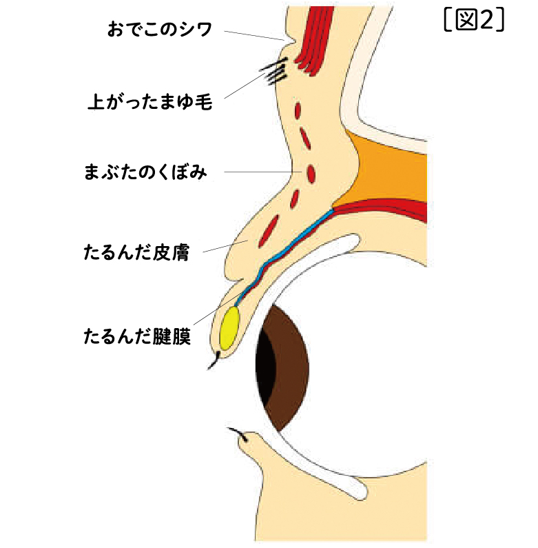 まぶたをあげる仕組みのどこかに異常があるのが原因となります。加齢と共に徐々に発症する眼瞼下垂症は腱膜が伸びてしまったり瞼板から外れてしまったりした場合や、皮膚がたるんでしまった場合に起こることが多いです(図2)。