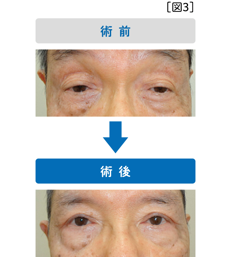 眼瞼下垂症にはいくつ手術法がありますが、当院においては主に次の2種類の手術を使い分けています。皮膚のたるみが主な原因と考えられる場合には余っている皮膚を切除する眼瞼皮膚切除術を行います。腱膜のたるみが主な原因と考えられる場合にはたるんでしまった腱膜を瞼板に再固定する挙筋前転法を行います(図3)。